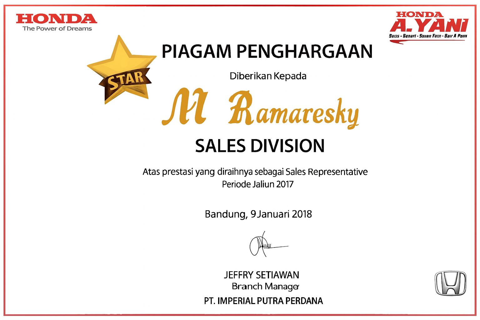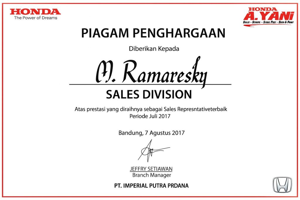 Supervisor Maketing Honda A. Yani